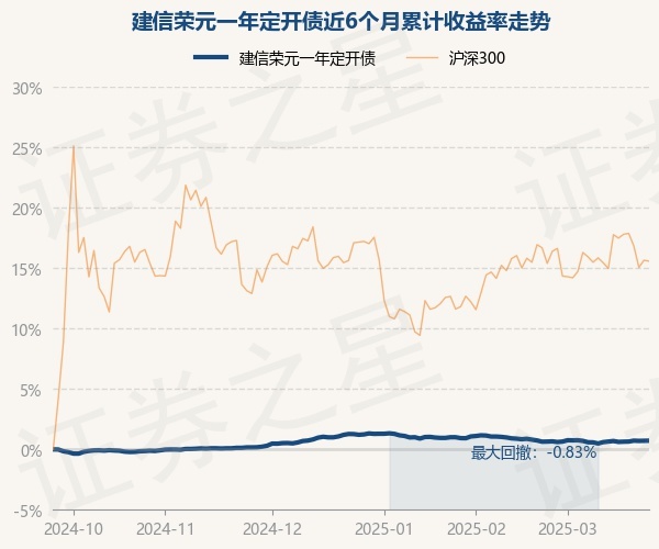 本站消息,3月25日,建信荣元一年定开债最新单位净值为1.078元,累计净值为1.135元,较前一交易日上涨0.01%。历史数据显示该基金近1个月上涨0.07%,近3个月下跌0.48%,近6个月上涨0.72%,近1年上涨2.76%。该基金近6个月的累计收益率走势如下图: